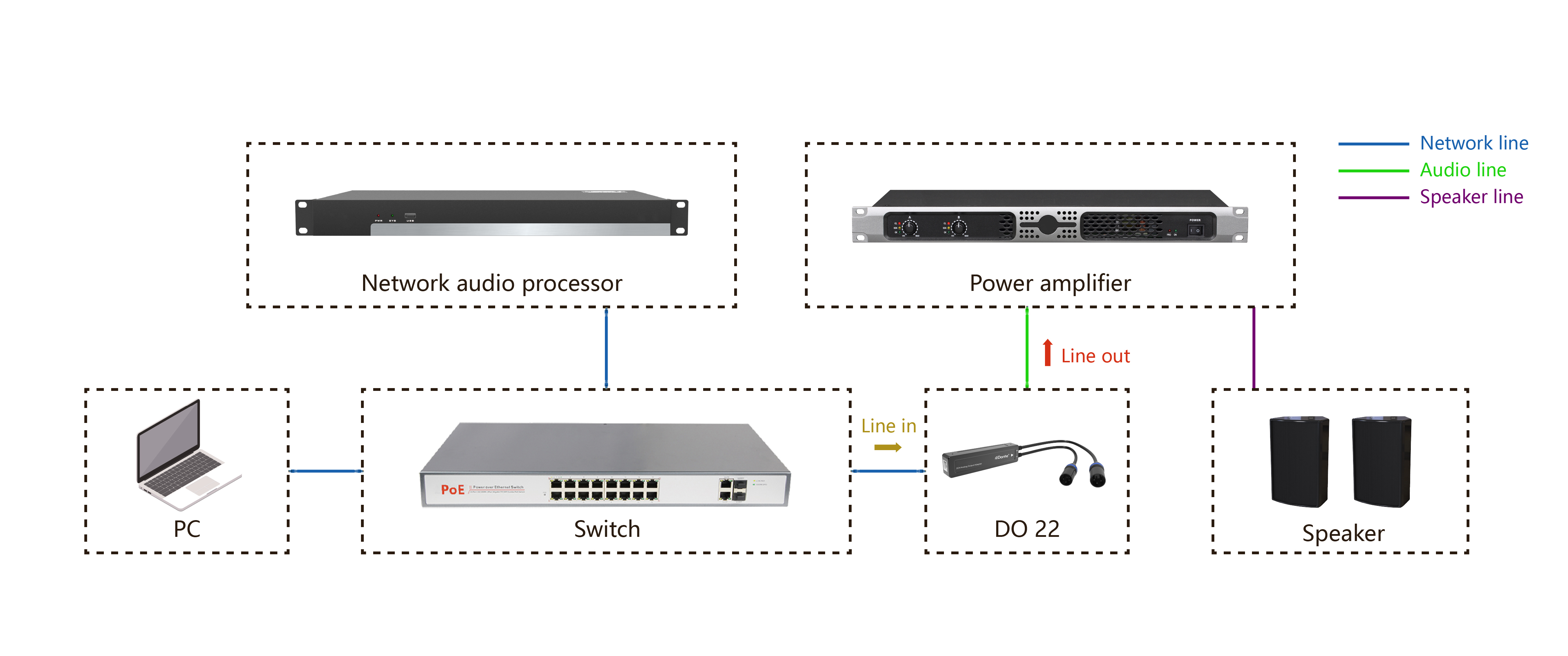 4. Преобразовать аудиосигналы Dante Network в аналоговые аудиосигналы для вывода.